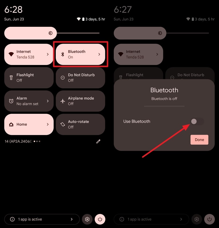 指示:首先向下滑动手机屏幕,然后再次向下滑动以访问完整的“快速设置”菜单。然后,找到“蓝牙”设置并查看它是否已打开。点击它,将出现一个弹出窗口,您可以在其中将其关闭。