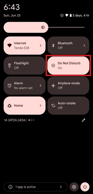 指示:从屏幕顶部向下滑动可打开通知面板并访问“快速设置”菜单。这次,寻找“请勿打扰”选项。如果您看到其图标突出显示,则表示它已在您的 Pixel 上启用。只需点击它即可关闭该功能,这可能有助于解决声音问题。