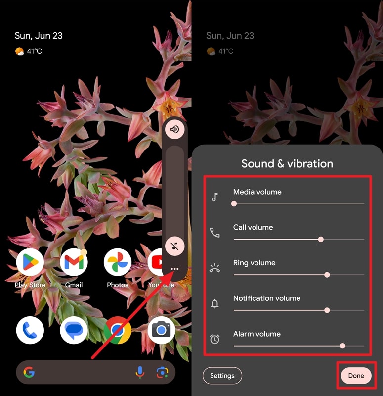 指示:首先,按“音量+”按钮以显示手机右侧的音量滑块。点击“三点”图标可访问详细的声音设置,您可以在其中检查不同类别的音频级别。只需检查其中是否有任何静音,然后点击“完成”即可。