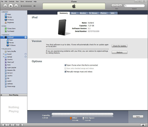 - 打开 iTunes 并使用 USB 数据线将 iPod 与电脑连接。 iTunes 将检测到您的 iPod touch,并显示在 iTunes 窗口的左侧面板中。