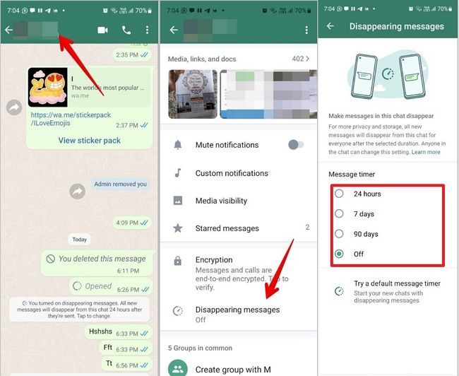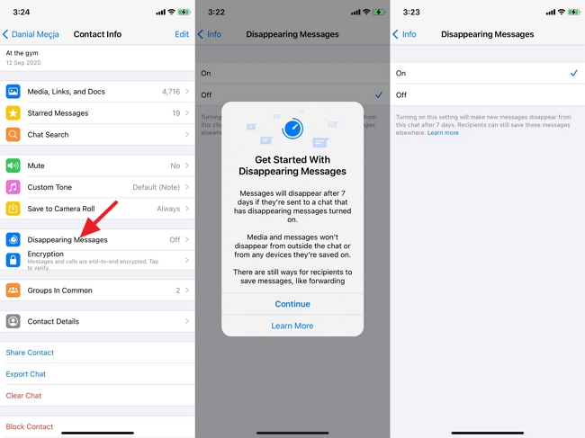 首先,打开 WhatsApp 对话,然后点击左上角的联系人图标。进入联系信息屏幕后,向下滚动,直到看到“消失的消息”选项,然后点击它。设置您想要的消失时间,然后继续。