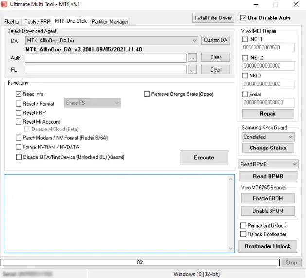 Ultimate Multi Tool MTK 处理联发科芯片组手机。 MTK 5.0 版本在 FRP 旁路、更快的刷新和更安全的 IMEI 修复方面增加了改进。它与较新的 MTK 小工具兼容,支持较新的引导加载程序,并提供更高的稳定性。该应用程序还包含固件刷新、分区备份和使用 Android 安全补丁等功能。