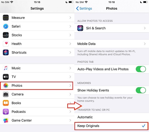 步骤 4:在“传输到 Mac 或 PC”下,从“自动”更改为“保留原件”。 (自动传输计算机格式的文件或始终传输原始文件而不检查兼容性)。