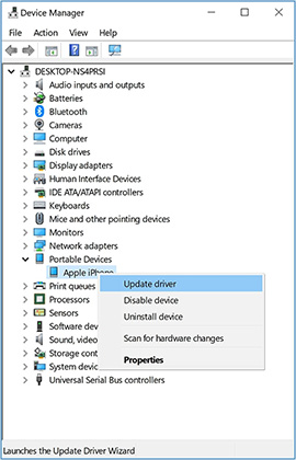 步骤 1:展开“设备管理器”的“便携式设备”部分。现在,右键单击 Apple iPhone 驱动程序,然后点击菜单中的“更新驱动程序”。