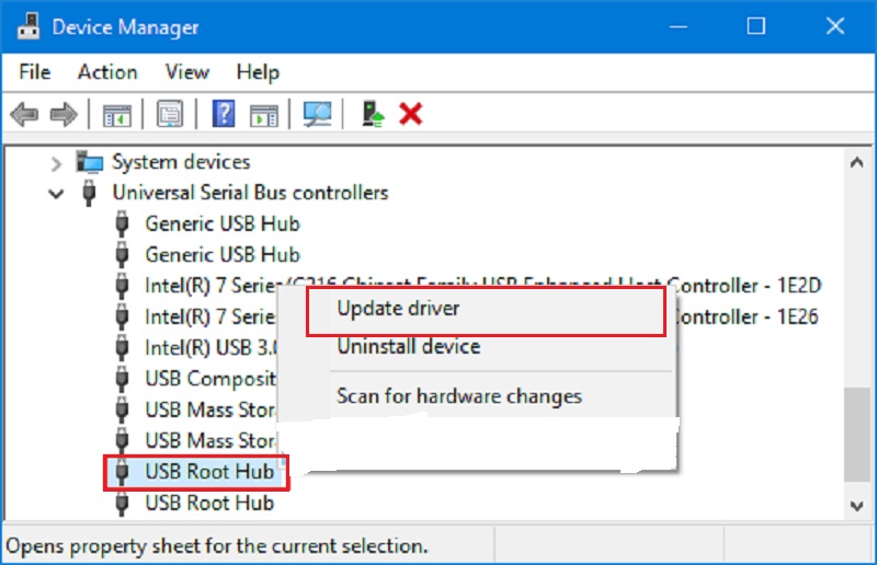 步骤 2:展开“通用串行总线控制器”选项卡,右键单击“USB Root Hub”,然后点击“更新驱动程序”。