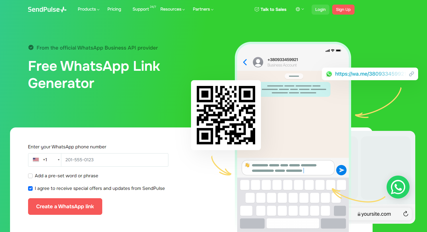 众所周知,发起新的 WhatsApp 对话可能会激怒新用户,因为他们必须找到电话号码、保存并输入新消息。然而,现成的链接将这个过程简化为一次点击。 SendPluse 允许 WhatsApp 用户创建其号码的短链接,并可以与其他用户共享。通过单击 SendPluse 创建的链接,用户可以轻松开始对话,而无需保存号码。此外,预先制作的消息有助于轻松开始对话。