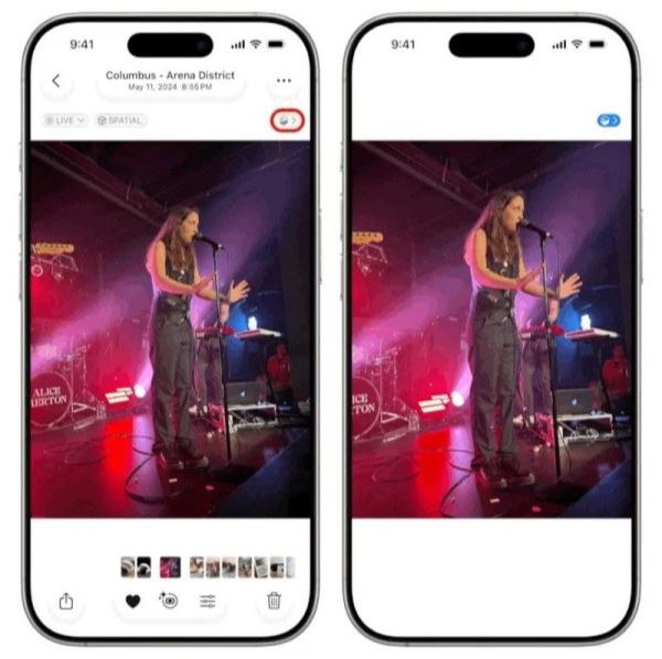 步骤一:打开“照片”应用程序。然后,选择您想要的图像。点击图片右上角带有箭头的六边形图标。应用“空间场景”效果。