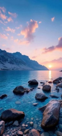 在这张 iOS 26 的空间壁纸中,人们可以看到平静的水面、前景中的岩石和背景中雄伟的山脉。柔和的夕阳天空也洒满了云彩。它展现出一种平静、灵性的氛围,因此成为一张很棒的 iPhone 壁纸,给心灵带来宁静。