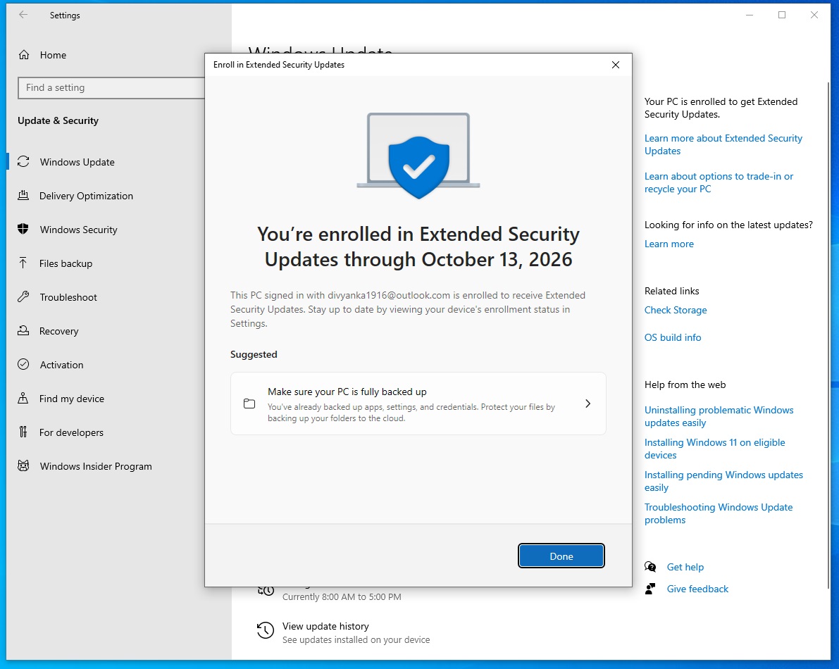 您可以立即注册,也可以在 2026 年 10 月 13 日之前随时注册。Microsoft 为每个人提供一年的时间来注册 ESU,但如果您不注册,您的电脑将不会获得任何更新。
