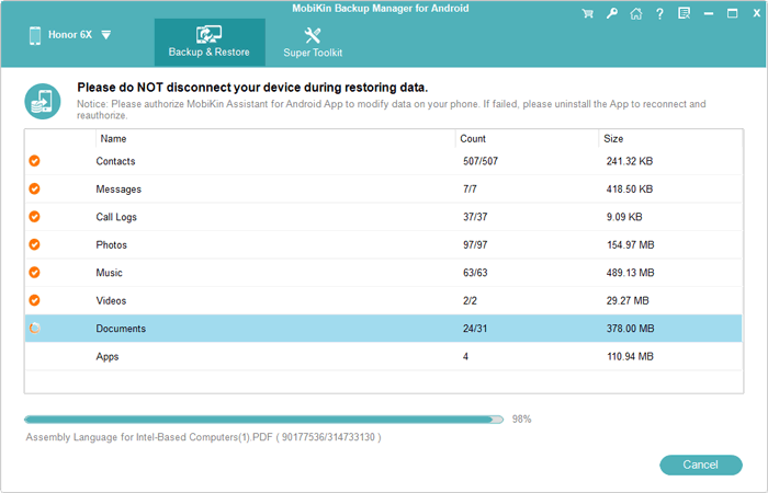 - 从备份文件还原Android手机/平板电脑。