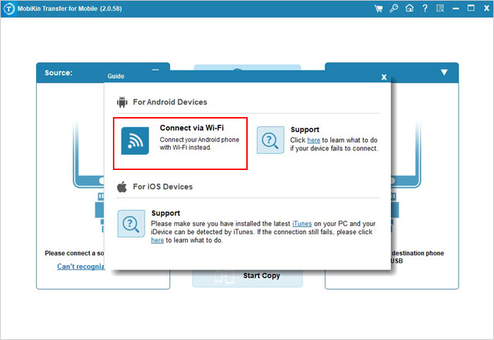 大多数适用于 Android 的 MobileKin 程序支持 2 种连接类型 - 通过 USB 或 Wi-Fi 连接(包括适用于 Android 的 MobileKin Assistant、适用于 Mobile 的 Transfer、适用于 Android 的橡皮擦或适用于 Android 的备份管理器)。然而,许多用户不知道如何完成该操作。那么在这里,我们想向您展示通过Wi-Fi连接Android手机的详细步骤。只需继续阅读即可获取分步教程。