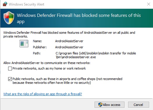 假设您是第一次将手机连接到该程序,点击“通过 Wi-Fi 连接”选项后,可能会弹出“Windows 安全警报”窗口。当它在 Windows 计算机上弹出时,您应该点击“允许访问”。