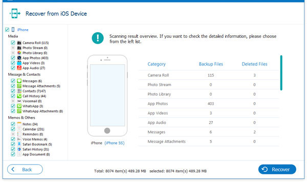 当程序识别您的iPhone时,它会自动扫描您iPhone上的所有数据,并按类别显示它们,如下所示: