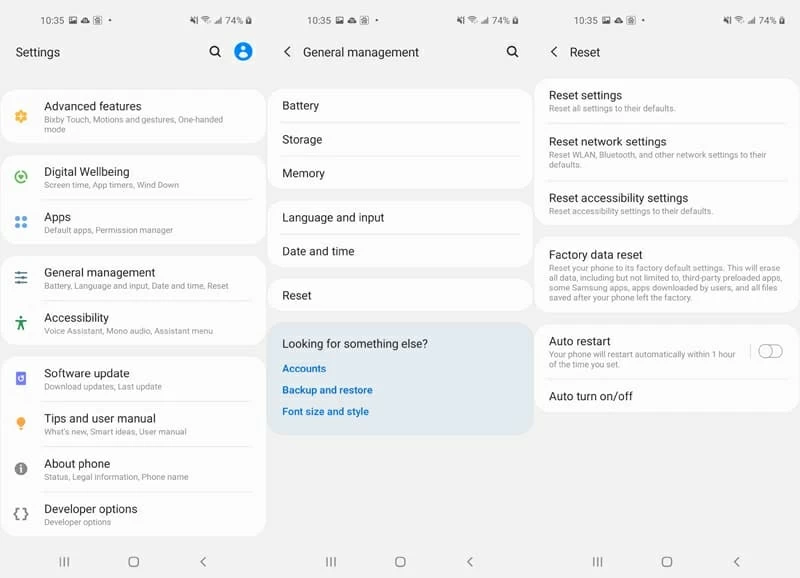 备份完所有数据后,您就可以开始在您的 Galaxy 手机上执行恢复出厂设置。在功能表模式下,点击设置 > 常规管理 > 重置 > 恢复出厂设置。