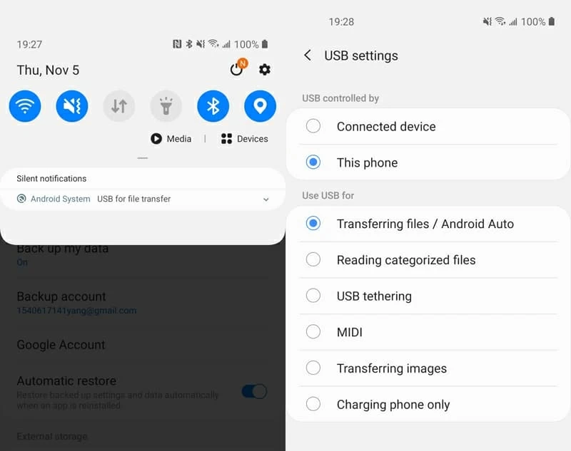 使用 USB 可以轻松完成在恢复出厂设置之前备份三星手机。无需安装应用程序,因为使用此方法只需要 USB 电缆即可拖放文件。您可以在恢复出厂设置之前将照片、音乐和一些有限的文件从三星手机逐件备份到电脑。使用方法如下: