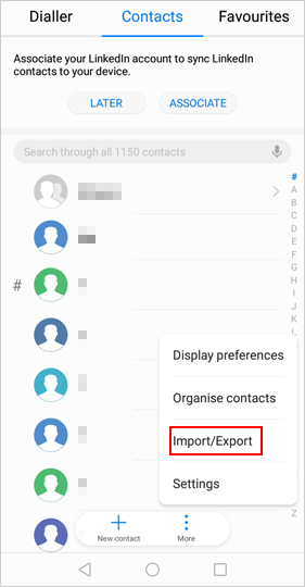 步骤1。在中兴手机上启动“通讯录”应用程序,然后单击右上角的“...”或“更多”按钮打开菜单。