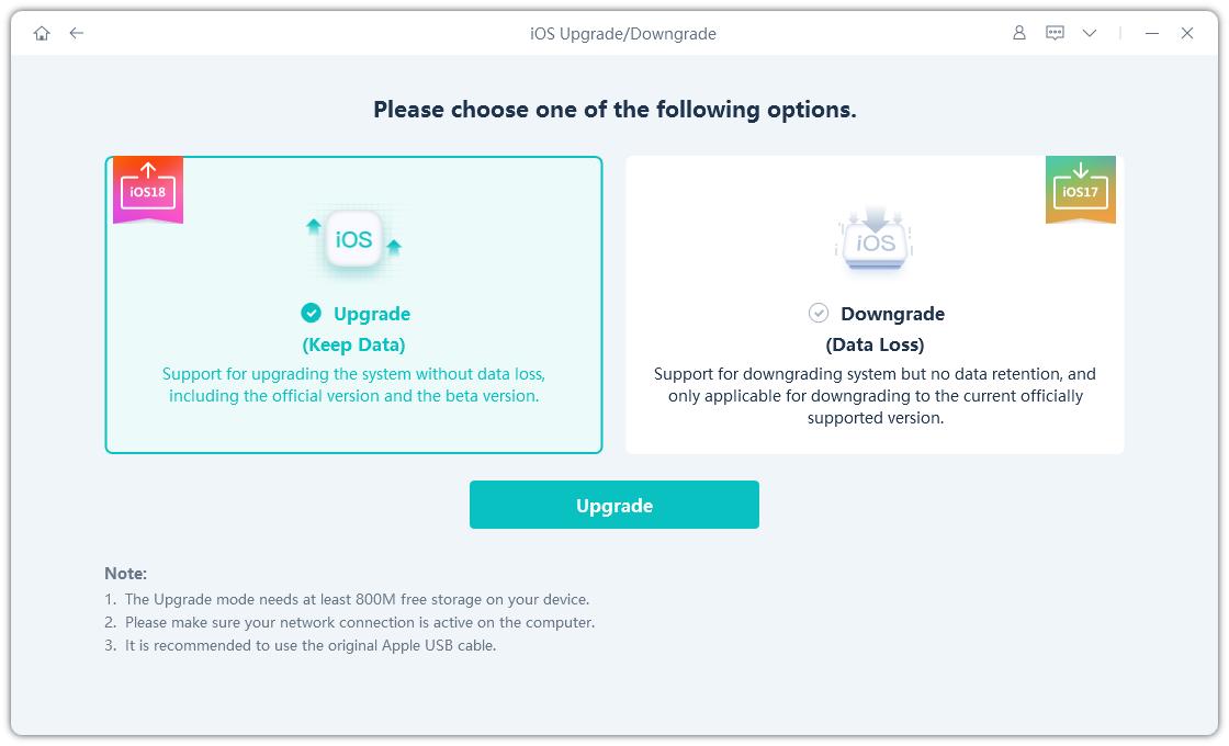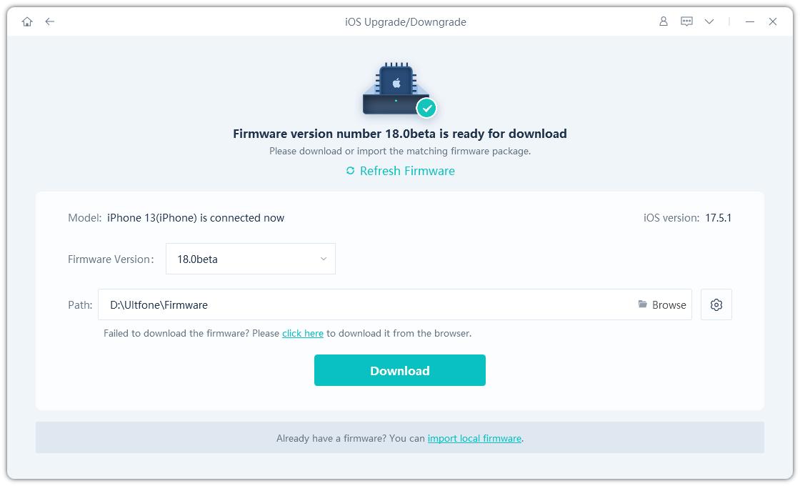 - 步骤2 下载 iOS 19 测试版固件选择“升级”并让该工具检测您的设备。然后下载iOS 19 Beta固件(或手动导入)。