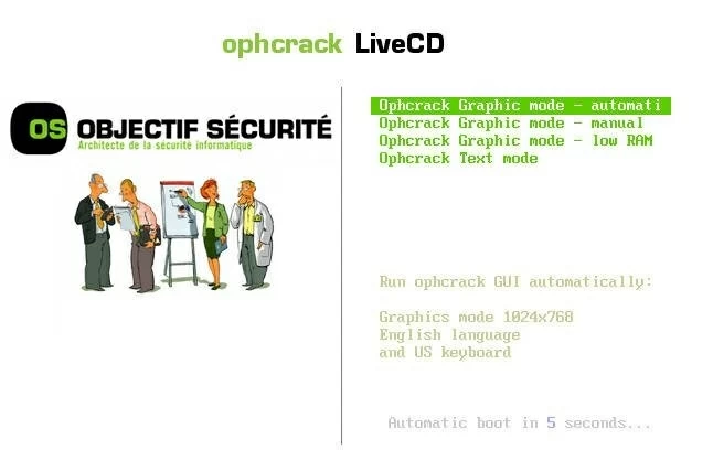 Ophcrack 将为您提供四种选项或模式。这两种模式都可以使用,但我们会选择图形模式,因为它更简单、更方便。因此选择Ophcrack Graphic Mode-Automatic并按Enter键。