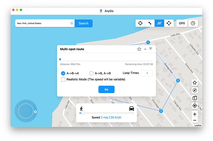 选择两点模式或多点模式,然后在地图上设置图钉以绘制路线。如果您想更改移动速度,请拖动底部的滑块以设置所需的速度以避免软禁。