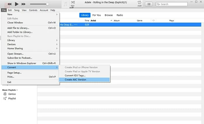 选择您刚刚添加的铃声,然后在左上角,找到“文件”>“转换”>“创建AAC版本”。之后,将在AAC版本中有铃声的副本。