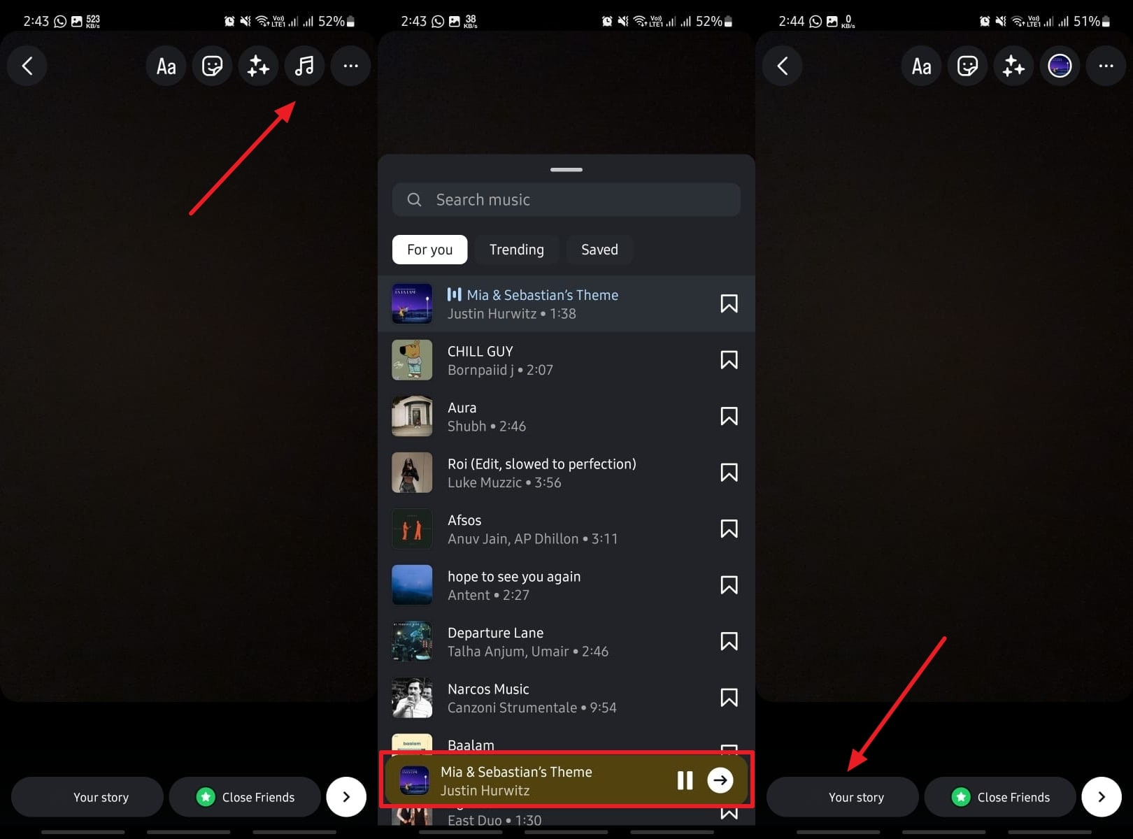 步骤2接下来,选择音乐并调整所需部分后按“完成”。之后,按屏幕底部的“你的故事”,上传后,点击“发送”。
