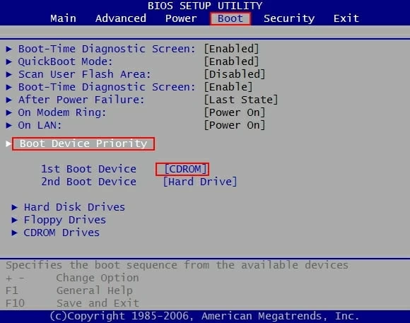 步骤1。使用键盘上的 → 或 ← 键导航至名为的菜单开机。然后使用 + 和 – 键在优先级列表中向上或向下移动设备。这里我们需要指定光驱作为第一启动设备选项。换句话说,保持“光驱” 在优先级列表中的第一个顺序上。