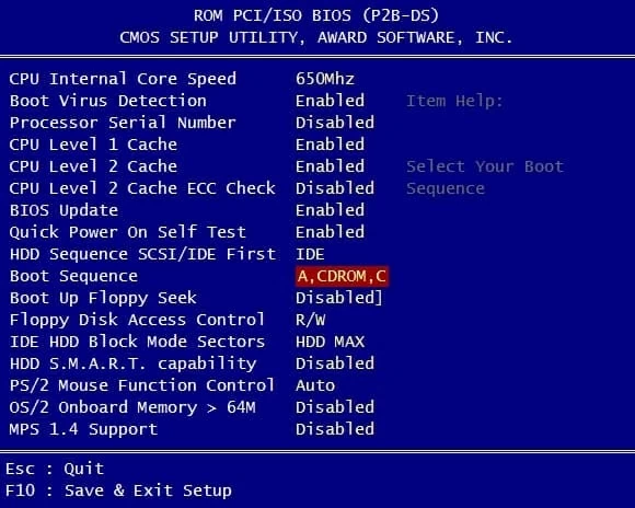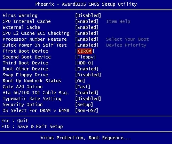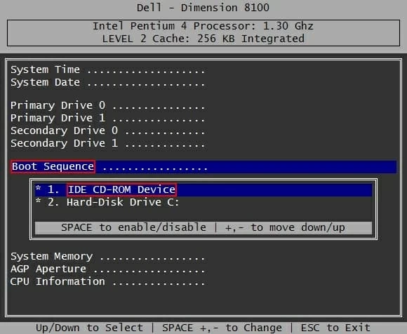 现在选择启动顺序然后设置1到光盘按 – 和 + 并按空格键即可启用它。