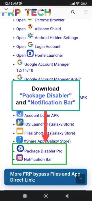 9. 在 FRPBypassTool.com 网站上,向下滑动并下载“Package Disabler Pro”和“Notification Bar”应用程序。
