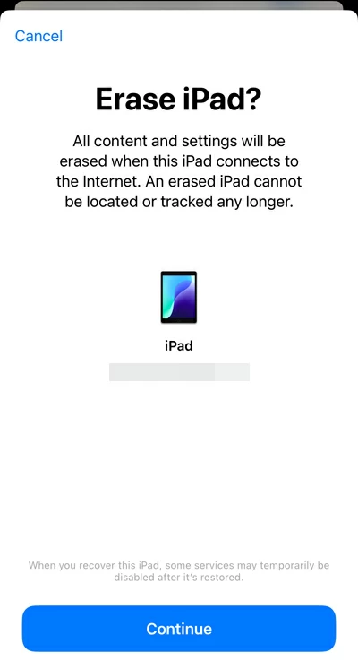 - 当系统询问是否擦除您的 iPad 时,请点按继续确认。