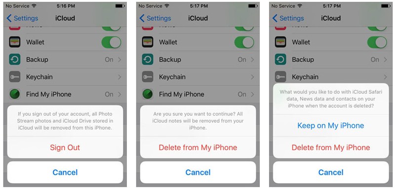 现在,我们回到iPhone,直接点击“设置 > iCloud > 注销 > 从我的iPhone删除 > 保留在我的iPhone上”。在这里,您需要输入当前登录的 Apple ID 的密码,然后单击“关闭”以禁用“查找我的 iPhone”功能。当这些步骤在 iPhone 上完成后,恭喜您,您已成功注销您的 Apple ID。