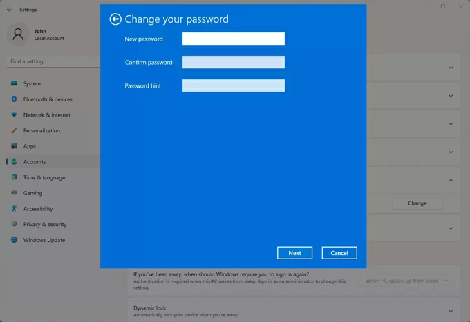 无论是 Microsoft 登录还是本地登录,这都是最简单的情况。您拥有帐户的完全访问权限,并且可以直接通过 Windows 11 的“设置”应用或系统配置修改您的密码。