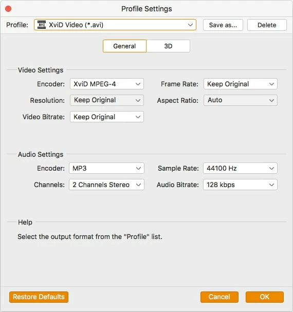 单击屏幕底部的“个人资料”。当配置文件窗口打开时,单击“常规视频”类别,然后选择“AVI”、“H.264 AVI”、“XviD (.*avi)”、“DivX (.*avi)”作为导出文件类型。