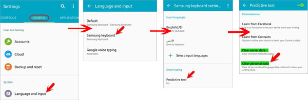 在Android上清除键盘历史记录非常容易,这里我们以三星手机为例。直接在Android设备上的“设置”下找到“语言和输入法”,现在可以找到“三星键盘”进行设置。一般来说,三星键盘是手机上的默认输入法,因此在这里,您可以选择它并勾选“预测文本”。之后,将显示两个清除选项供您参考——清除服务器数据和清除个人数据。