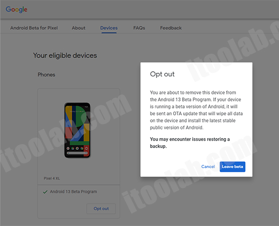 第4步:现在,您将收到一条有关选择退出的警告消息。通过单击离开测试版按钮确认选择退出,它将向设备发送 OTA 更新,以从 Android 13 回滚到 Android 12,擦除设备上的所有数据并将设备恢复到 Android 12 的稳定版本。