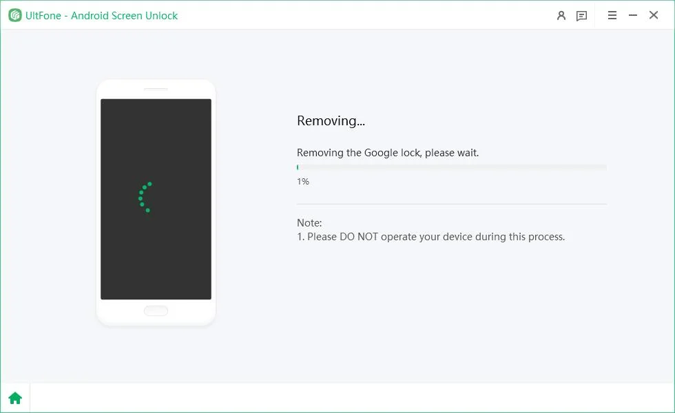 - 步骤4UltFone 将开始绕过 Google FRP 锁。等待几分钟,让该过程完成。之后,无需 Google 帐户或密码即可访问您的设备。