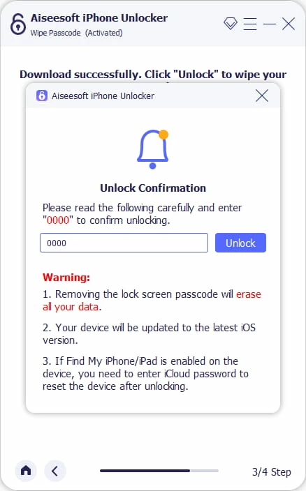4. 固件准备就绪后,输入0000,然后点击开锁。该软件将开始将 iPhone 17 重置回初始设置并删除屏幕锁定密码。