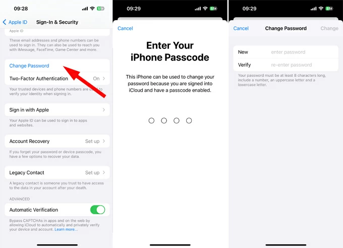 3. 按照屏幕提示输入您的 iPhone 密码并为您的 Apple 帐户创建新密码。