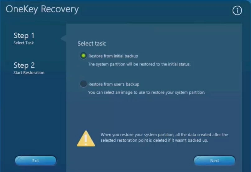 - 从初始备份恢复:将系统重置为原始出厂状态。