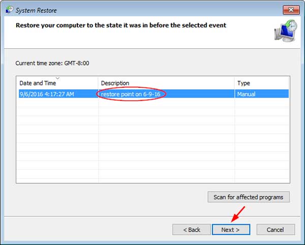 4. 在“在此列表中,单击还原点”列表中,选择最相关的系统还原点,然后单击“下一步”。
