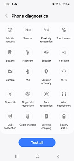只需转到设置,找到电池和设备护理即可。点击诊断以访问电话诊断页面。您可以选择测试所有功能或仅测试触摸屏。