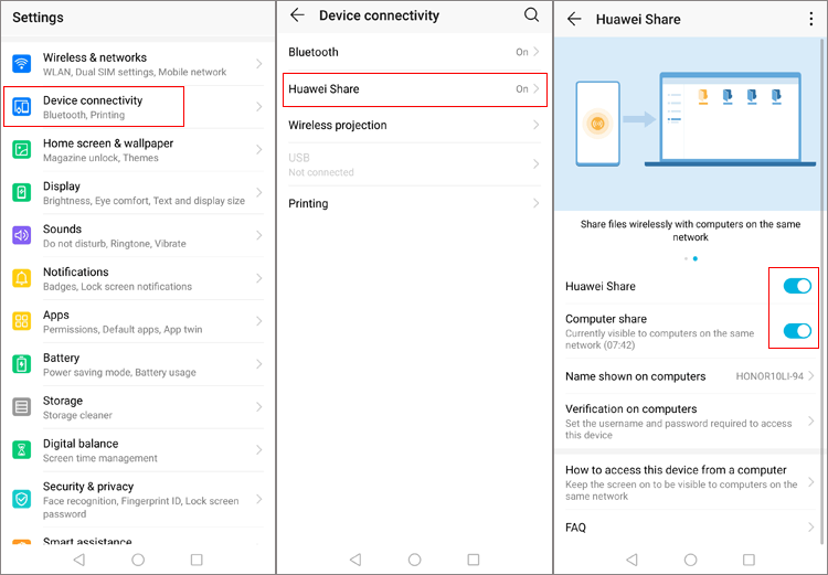 - 在华为手机上,在“设置”>“设备连接”中打开“Huawei Share”。