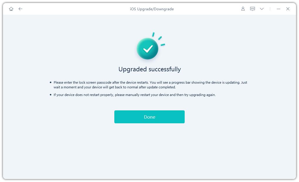 - 步骤4UltFone 可以快速轻松地将您的 iPhone 从 iOS 18 降级到稳定的 iOS 17 版本,为您的 iPhone 提供顺利修复ipad 卡在锁屏 ios 18 上验证更新上。最后,完成后单击“完成”。