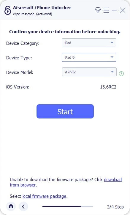 单击“开始”按钮,等待该工具下载适合您设备的 iPadOS 软件。如果您有良好的宽带互联网连接,下载将很快完成。