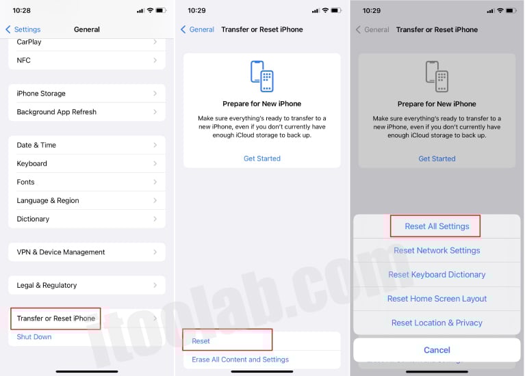 装有 iOS 18/17/16/15 的 iPhone:前往“设置”>“通用”>“传输或重置 iPhone”>“重置”>“重置所有设置”。