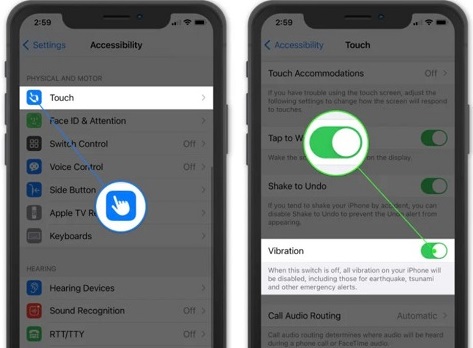 步骤 3. 现在,单击屏幕上显示的“辅助功能”选项。现在您可以看到振动选项。需要打开切换选项。打开后,该切换按钮会变成绿色。检查您的 iPhone 是否立即开始振动。
