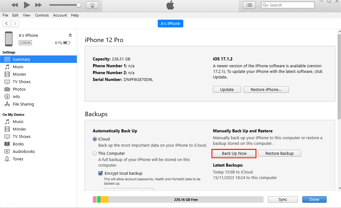 - iTunes 识别出您的设备后,选择概括选项卡,然后单击立即备份创建 iPhone 数据的备份。