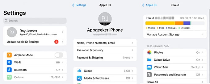将照片上传到 iCloud 需要足够的 iCloud 存储容量。如果您的 iPhone 没有足够的 iCloud 存储空间,上传照片将被停止。请注意,iCloud 仅提供 5GB 的可用空间。因此,您需要先了解 iCloud 存储空间还剩多少。为此,请导航至“设置”> [您的姓名] >“iCloud”。