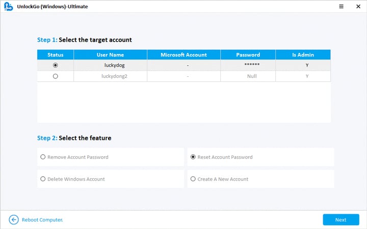 步骤3:然后您的计算机将重新启动,然后您可以看到UnlockGo(Windows)图标,然后选择Windows系统以选择目标管理员帐户以根据您的要求重置或删除密码。