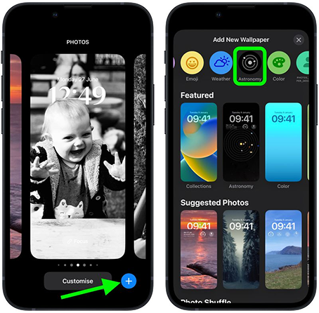 - 在顶行中选择iOS 16天文学壁纸集合。您可以向左或向右滑动,以预览包括地球,地球细节,月亮,月球细节和太阳系的不同天文壁纸。