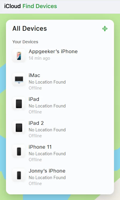 3. 在“所有设备”模块中,选择您想要解锁的不可用的 iPhone 17。如果您在此处找不到您的设备,很可能它已离线,或者“查找我的 iPhone”功能已打开。如果您遇到这种情况,您应该采用本文中提到的其他方法来打开 iPhone 不可用屏幕。